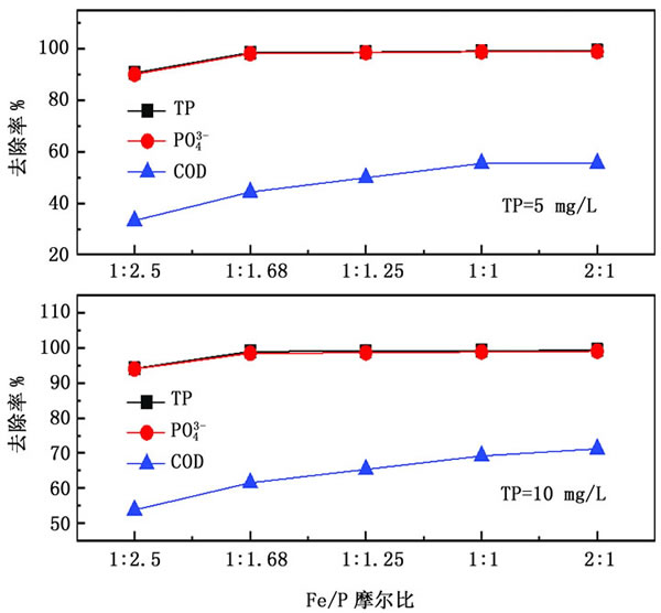 當初始磷濃度較低時,可能需要加入更多的鐵才能提高總磷和磷酸鹽的去除率,為了驗證這一想法,提高Fe/P摩爾比,以得到當初始磷濃度為5 mg/L和10 mg/L時的較佳加藥量,實驗結果如圖5所示。由圖5可知,其他反應條件不變,以Fe/P摩爾比=1:1.68為較佳加藥量,此時總磷的去除率分別為98.6%和98.9%,磷酸鹽的去除率分別為98.1%和98.4%,COD去除率分別為44.4%和61.5%。