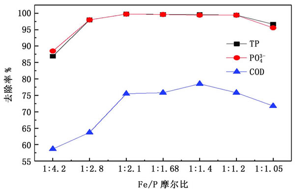 圖2 不同Fe/P摩爾比對總磷、磷酸鹽和COD去除的影響