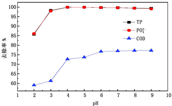 由圖3可知,隨著pH值的升高,總磷、磷酸鹽和COD的去除率先上升后趨于平穩(wěn)。當反應pH為2~3時,總磷、磷酸鹽和COD的去除效果相對較差,總磷和磷酸鹽的去除率低于98%,COD去除率低于61%,反應的較佳pH值為4~9。當向廢水中加入液態(tài)聚合硫酸鐵,Fe/P摩爾比為1:2.1時,水樣pH值由原來的7.6降至5~6,此時的pH值在較佳反應pH值范圍內,總磷和磷酸鹽的去除率高于99%,COD去除率高于72%,因此,在實際工程應用中,按照Fe/P摩爾比為1:2.1向水樣中加入液態(tài)聚合硫酸鐵后不需要額外調節(jié)水樣的pH值,同時處理后的廢水進入兼氧池和好氧池,其pH值也滿足上述反應池要求。
