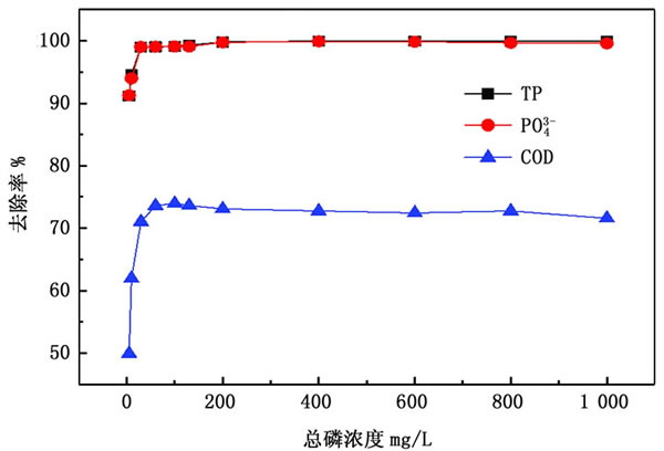 圖4 初始磷濃度對總磷、磷酸鹽和COD去除的影響